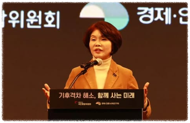 한정애 전 환경부 장관은 2021년 환경부 수장으로 취임하면서 탄소중립을 본격적으로 추진한 인물입니다. 2050년까지의 탄소중립 시나리오와 2030 온실가스 감축 목표를 법제화했으며, P4G 서울 정상회의 개최와 국제 메탄서약 참여, 석탄화력 중단 선언 등 국제적 환경 외교에서도 성과를 거두었습니다.