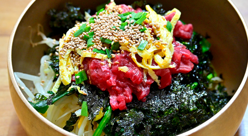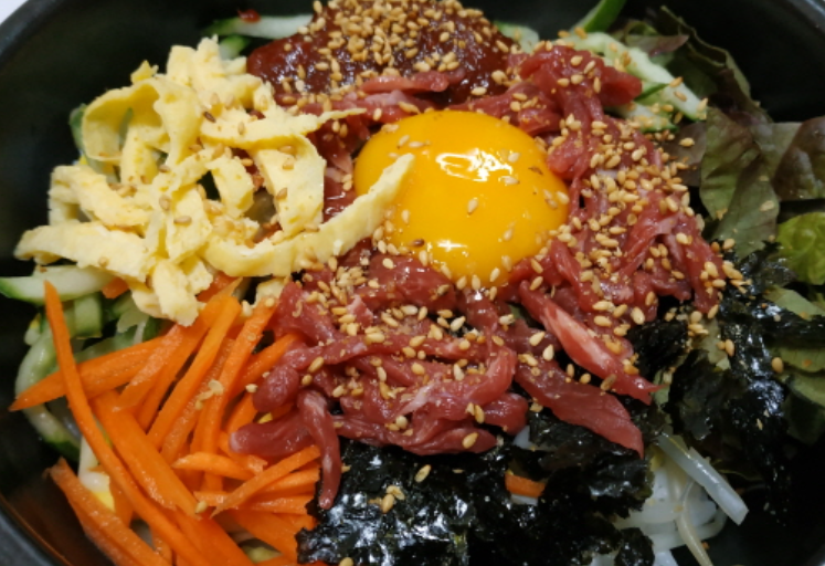 돼지비계의 고소함과 육회의 담백함이 어우러져 색다른 맛을 선사합니다. 육회비빔밥에는 적당량의 고추장과 취향에 따라 무생채, 겉절이를 넣어 비벼 먹으면 됩니다.