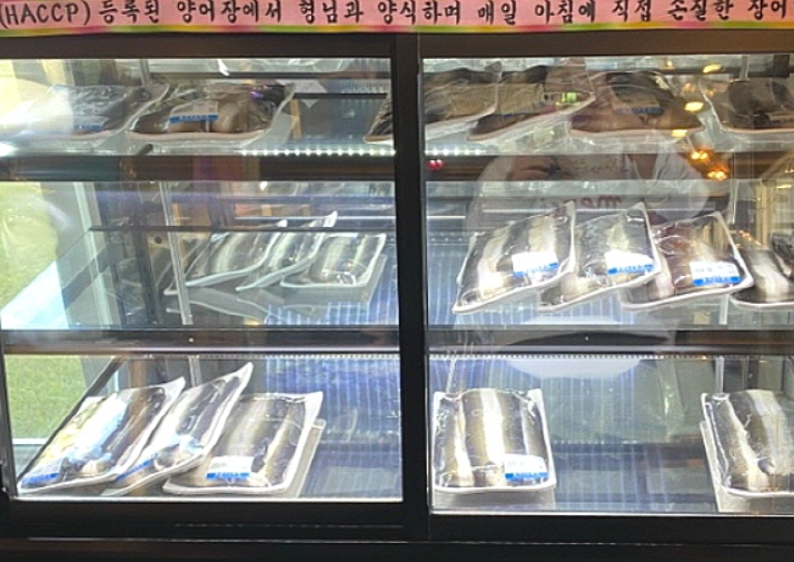 월야88민물장어에서는 입구 옆에 준비된 손질된 장어를 직접 골라 구입할 수 있습니다. 테이블에 앉으면 밑반찬과 함께 세팅이 완료되어 편리하게 장어구이를 즐길 수 있습니다.