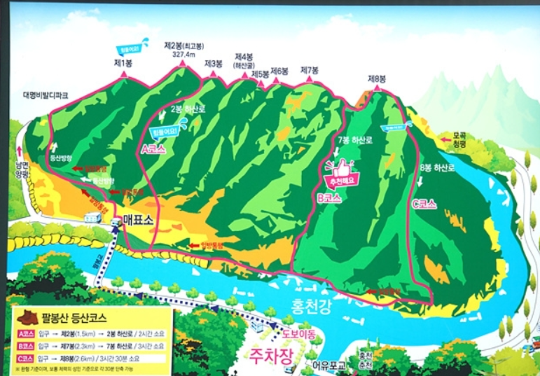 여덟 개의 봉우리가 팔을 벌린 듯 이어져 있는 팔봉산은 홍천을 대표하는 명산입니다. 1봉부터 8봉까지 이어지는 등산 코스는 험준하지 않아 초보자도 쉽게 오를 수 있으며, 각 봉우리마다 색다른 풍경을 선사하여 지루할 틈이 없습니다.