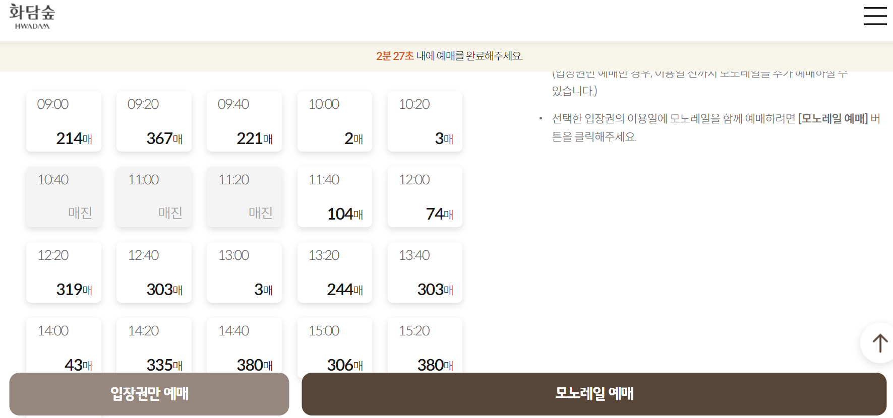 원하시는 일자와 시간 예매 매수를 선택가능합니다. 온라인 예매는 발권 전까지 가능하지만 당일 취소 시 결제 금액의 30% 수수료 부과되고 있습니다. 하지만 현재 성수기인 가을 시즌으로서 매진이 많은 상황입니다.