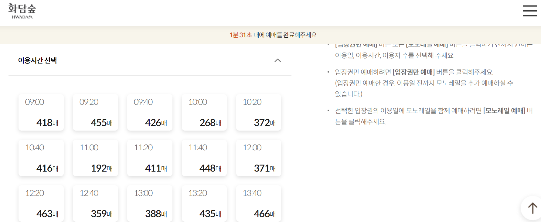 원하시는 일자와 시간 예매 매수를 선택가능합니다. 온라인 예매는 발권 전까지 가능하지만 당일 취소 시 결제 금액의 30% 수수료 부과되고 있습니다. 하지만 현재 성수기인 가을 시즌으로서 매진이 많은 상황입니다.