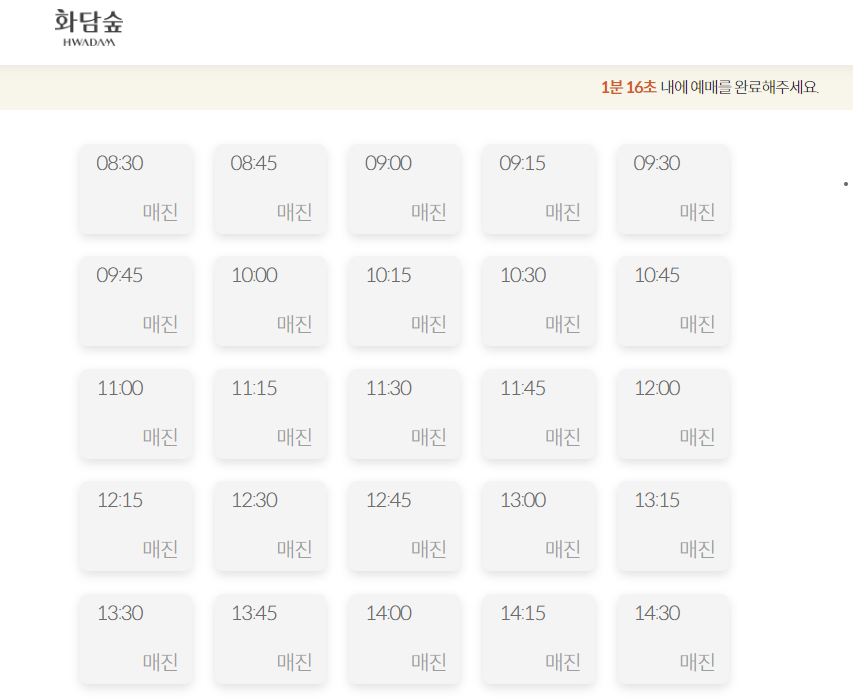 카카오톡 혹은 문자로 모바일 티켓(큐알코드등)이 발송되며 예매 완료후 전송되며 입장시에 사용하시면 됩니다. 화담숲 예약은 기본적으로 오전 8시30분부터 15분단위로 진행되고 있습니다.