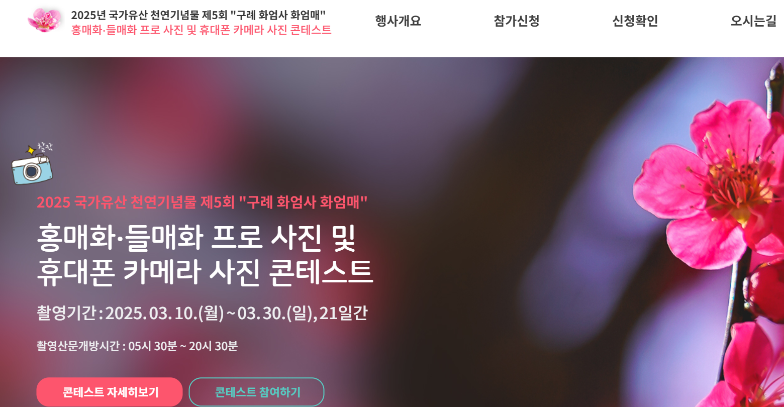 참고로 대한불교조계종 제19교구 본사인 지리산대화엄사는 3월 10일부터 30일까지 '화엄! 홍매화의 향기를 머금고~'라는 주제로 제5회 화엄사 홍매화·들매화 프로사진 및 휴대폰 카메라 사진 콘테스트를 개최합니다.
