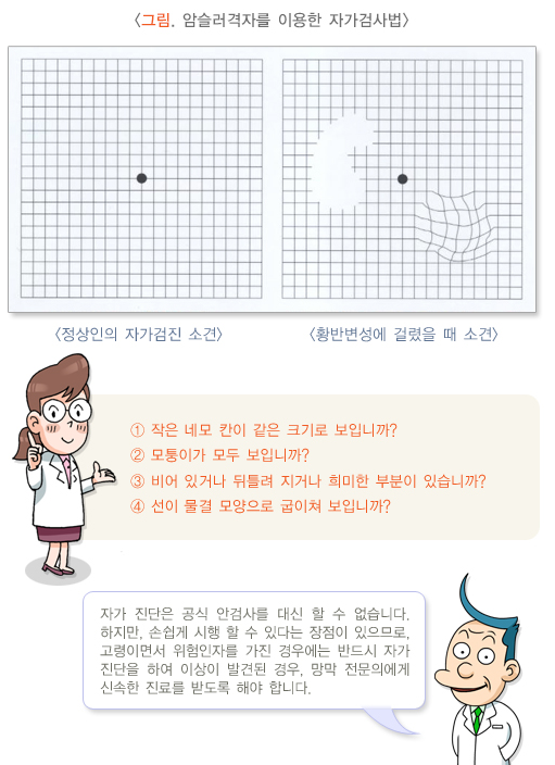 황반변성은 조기에 발견하여 치료할수록 시력 손상을 예방하고 진행을 늦출 수 있습니다. 따라서 평소에 암슬러 격자를 이용하여 자가 진단을 해보는 것이 좋습니다.