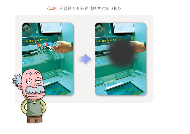 뿐만 아니라 시야 중심부에 맹점이 생겨 사물의 일부가 보이지 않는 경우도 있습니다. 마치 그림의 일부가 지워진 것처럼 보이며, 암점의 크기는 점점 커질 수 있습니다. 색깔이 흐릿하게 보이거나 명암을 구별하기 어려워지는 것도 황반변성의 증상 중 하나입니다.