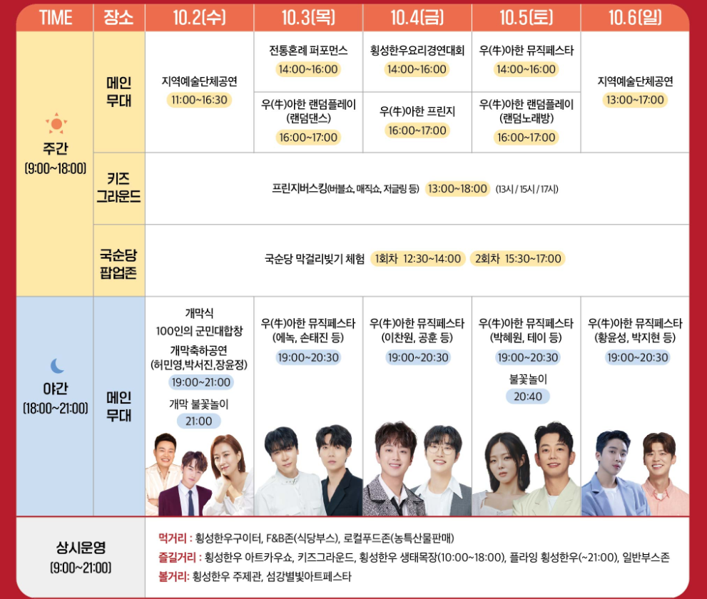 축제 기간 동안 횡성한우 스페셜 콘서트도 열리며, 박서진, 장윤정, 손태진, 이찬원 등 인기 가수들의 공연이 이어집니다. 각 날짜별로 다른 라인업이 준비되어 있어 매일 색다른 분위기를 즐길 수 있습니다.