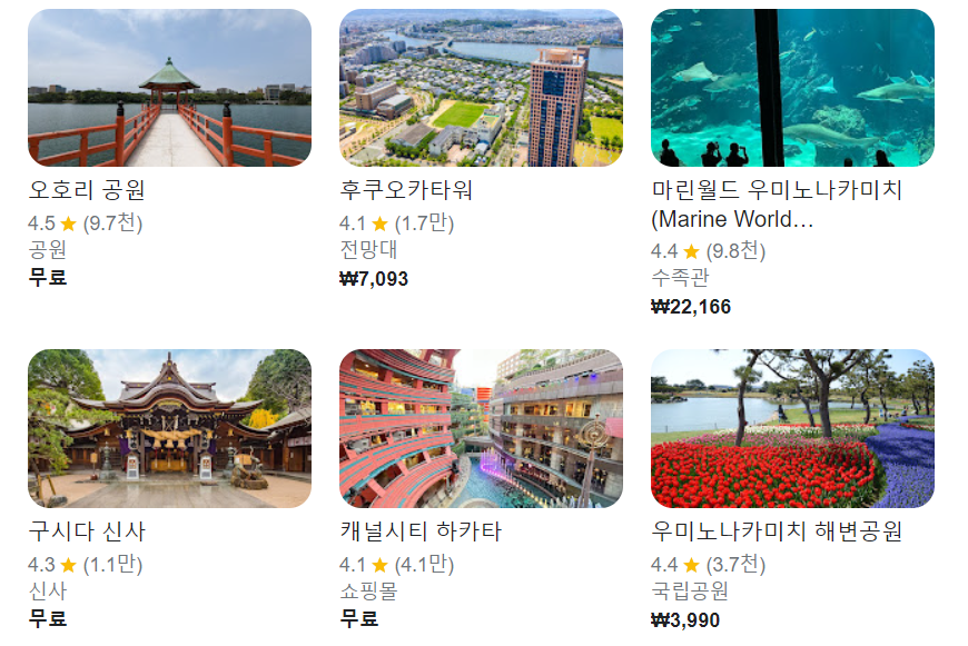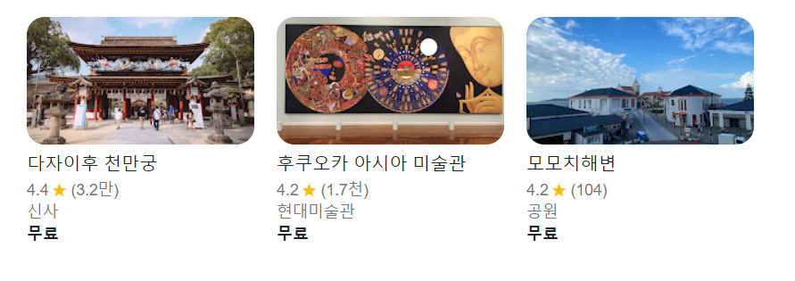 이외에 모모치해변, 동장사, 후쿠오카 성터, 구시다 신사등 다양한 방문 옵션들이 있으니 오늘 안내해 드린 정보도 참고하셔서 여행 계획을 잘 세워보시기 바랍니다.