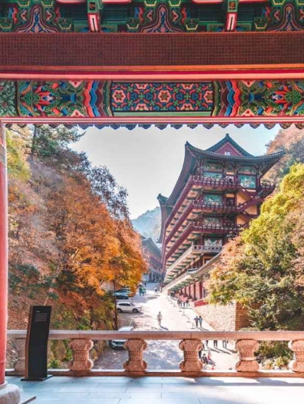 구인사는 대한불교 천태종의 총본산으로, 웅장한 규모와 아름다운 건축물로 유명합니다. 10월이면 구인사 주변을 둘러싼 산들이 붉고 노랗게 물들어 장관을 이루고 있습니다.