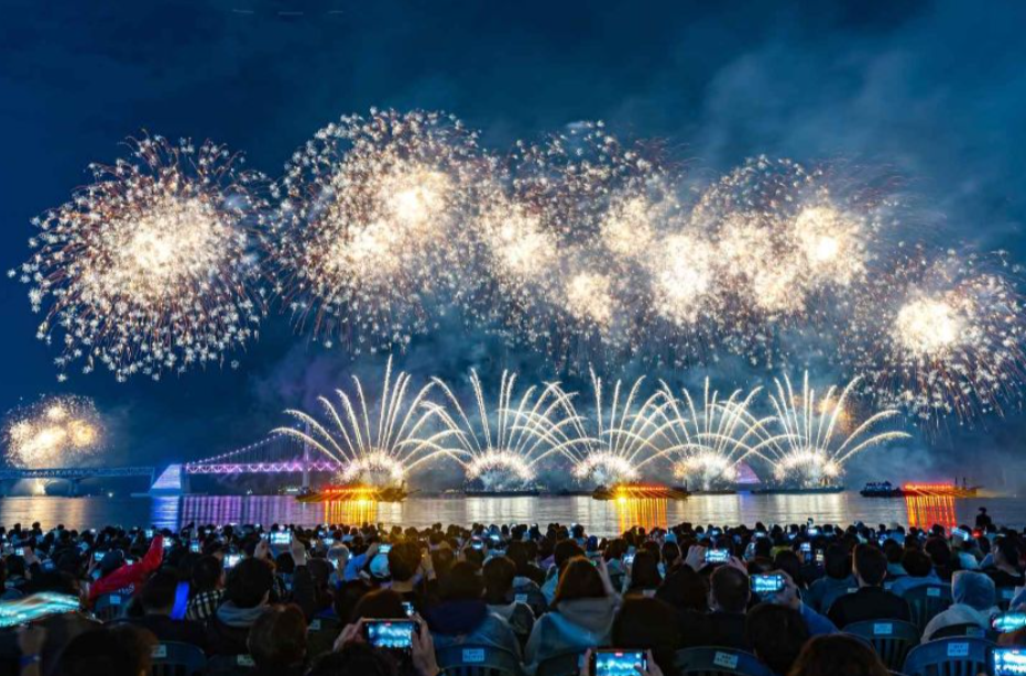 광안대교를 중심으로 한 불꽃 연출은 마치 부산의 밤하늘이 살아 움직이는 듯한 생동감을 주며, 불꽃이 터질 때마다 주변을 밝히는 광경은 관객에게 숨 막히는 감동을 선사합니다.