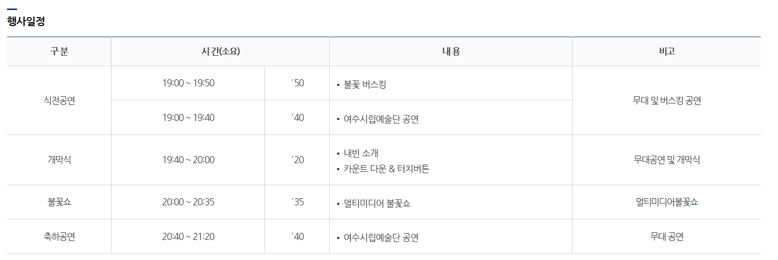 주요 행사로는 개막식과 함께 여수의 밤하늘을 드론이 수놓는 라이트 드론쇼, 그리고 화려한 해상 불꽃쇼가 포함되어 있습니다. 이 외에도 버스킹 공연과 지역 공연팀의 무대가 이어지며, 다양한 볼거리와 즐길 거리가 가득한 축제로 기대를 모으고 있습니다.