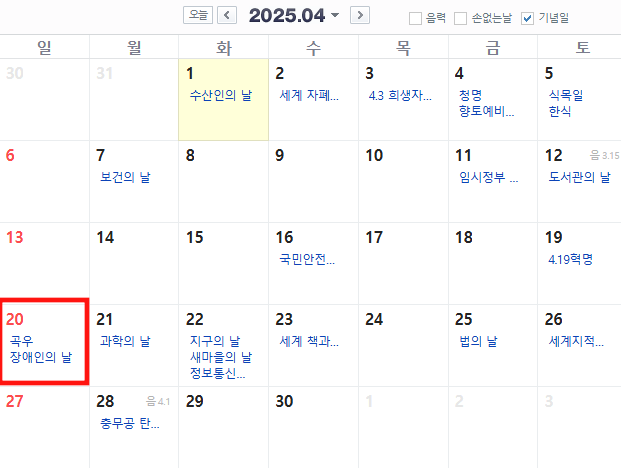 2025년 4월 20일은 일요일입니다. 그리고 이 날짜는 "곡우"와도 겹치네요. 곡우는 24절기 중 하나로, 봄의 끝자락을 알리는 시점에 해당하며, 주로 농업과 관련된 의미를 가집니다. 2025년 곡우는 4월 20일에 해당하는 날입니다.
