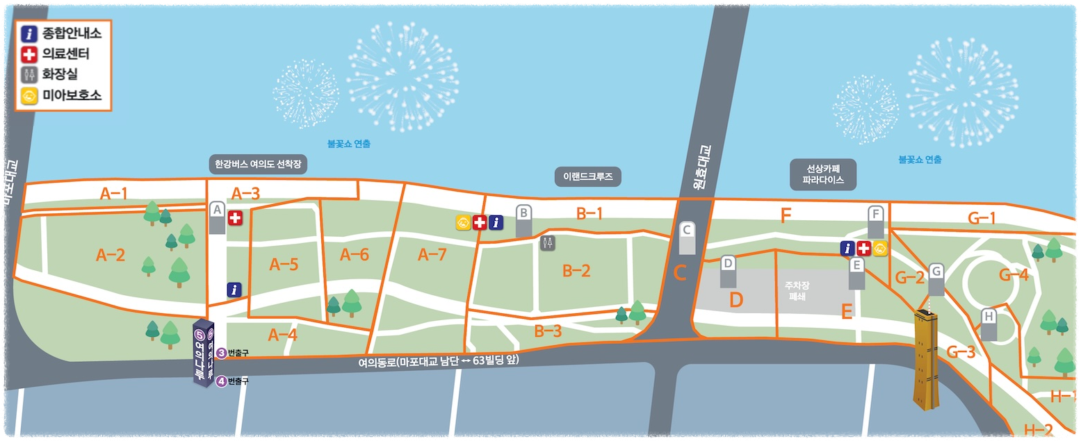 축제 장소는 마포대교부터 한강철교 구간까지 넓게 이어지며, 서울 영등포구에 위치한 한강변이 불꽃과 다양한 행사로 가득 찰 예정입니다. 이번 축제는 한화와 SBS가 주최하고 서울특별시가 후원하는 대규모 행사입니다.