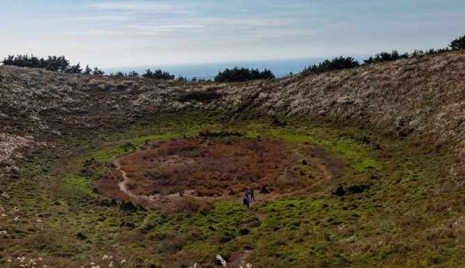 산 전체가 초록색 융단처럼 펼쳐지며, 바람이 지나갈 때마다 숲이 흔들리는 소리와 새소리가 조화를 이룹니다. 오름 아래쪽에는 제주 전통 돌담과 들꽃이 어우러진 시골 풍경이 펼쳐지며, 정상에서는 한라산과 주변 오름들까지 조망할 수 있어 트레킹을 즐기는 이들에게 인기가 많습니다.