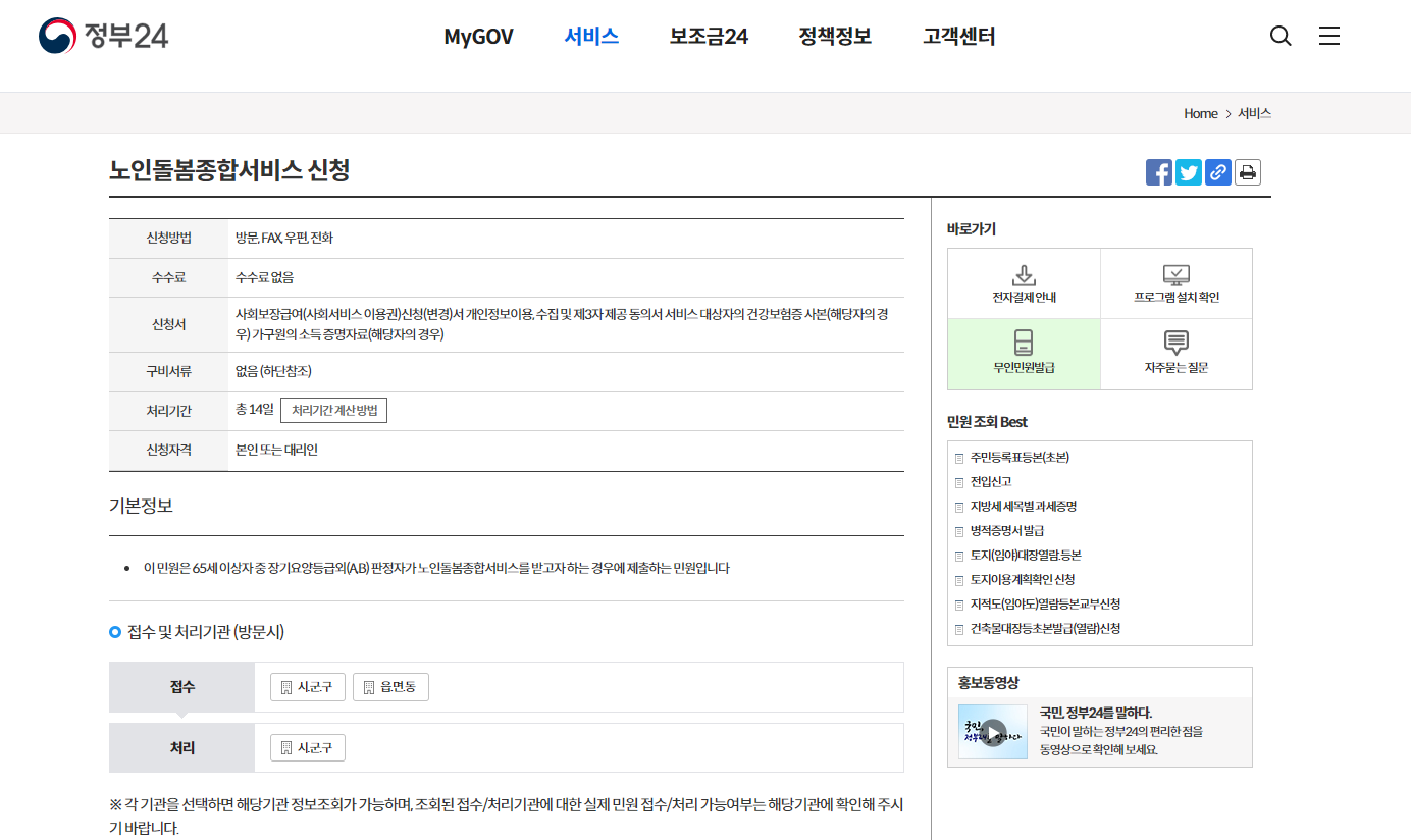 만약 이러한 조건에 해당이 되신다고 한다면 나라에서 지원하는 노인 돌봄 서비스를 적극활용해 보시기 바랍니다. 매일 3시간 정도의 돌봄 서비스를 무료로 받으실 수 있습니다.