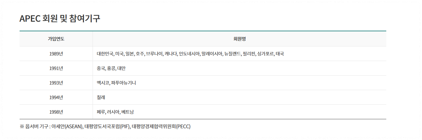 APEC은 Asia-Pacific Economic Cooperation의 약자로, 1989년 아시아·태평양 지역에서 상호 경제 협력을 활성화하기 위해 설립된 지역 경제 포럼입니다.