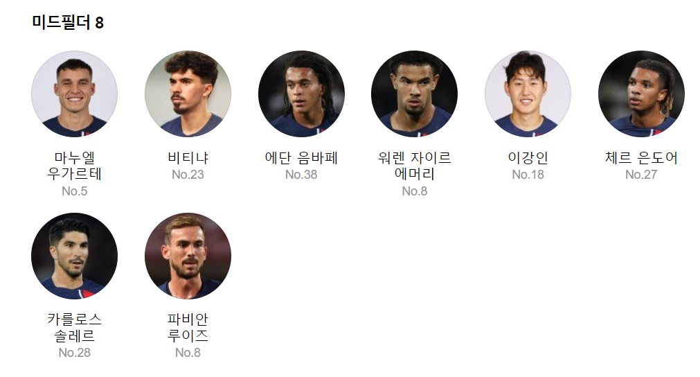 공격수는 세계적인 공격수 음바페를 비롯하여 총 7명으로 구성되어 있습니다. 미드필더는 대한민국 선수 이강인을 비롯하여 총 8명으로 구성되어 있습니다.